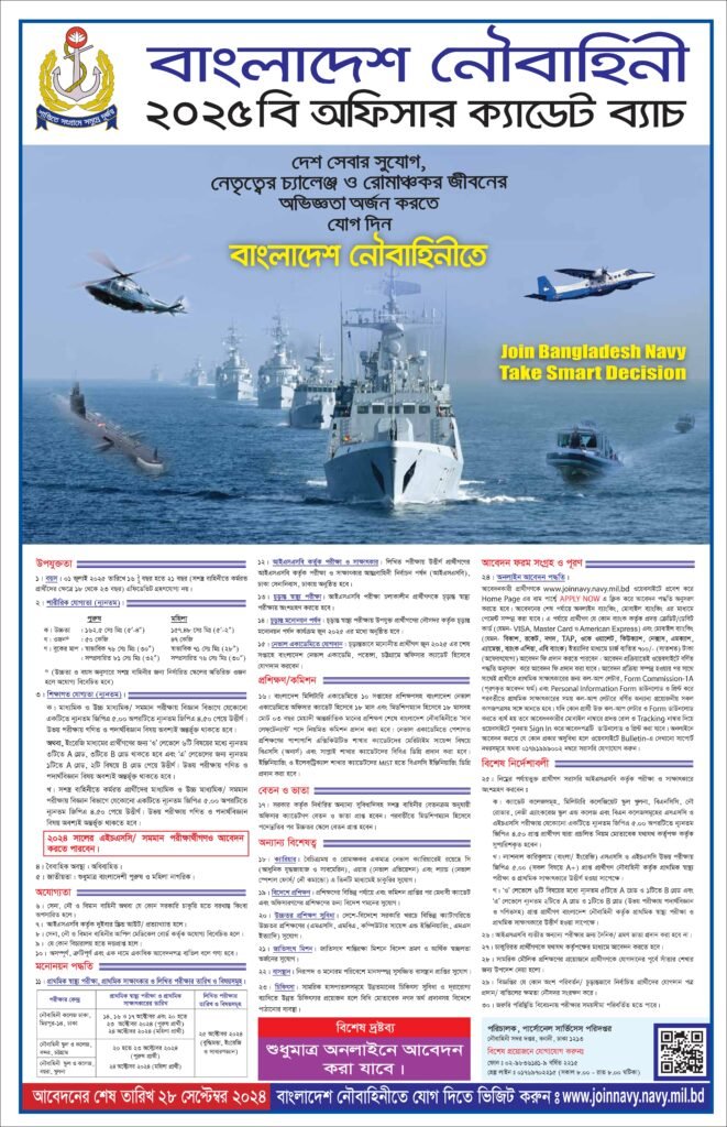 The Bangladesh Navy has officially released the BN 25/B Circular for the recruitment of Officer Cadets for 2024. This circular provides all the essential details regarding age, physical qualifications, educational requirements, and the application process. Below is a comprehensive breakdown of the eligibility criteria and important information you need to know.
